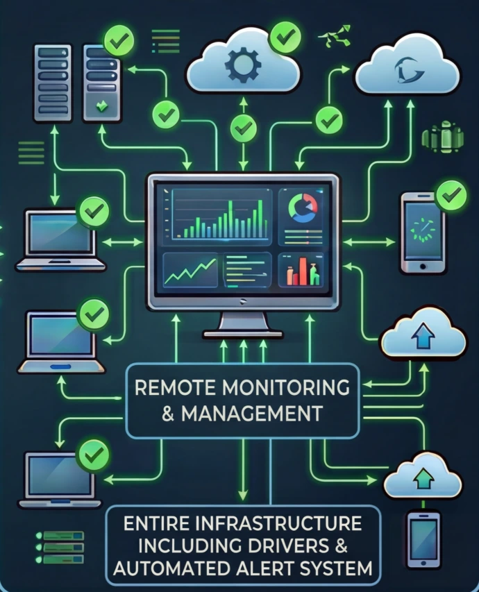 - Remote Monitoring — Continuous, real-time monitoring of every endpoint — tracking performance, health, connectivity, and potential threats across your entire device fleet.